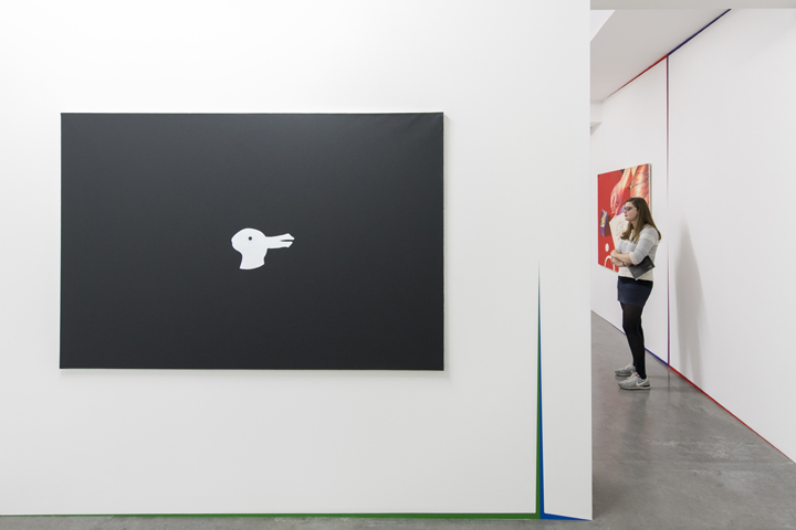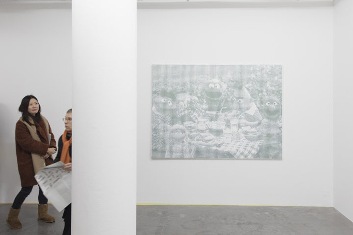 (Paris.) Over the years, Le Plateau has earned a reputation for some of the most mind bustling, abstracty conceptualistiest exhibitions of contemporary art in Paris. To appreciate the standard Le Plateau experience, a PhD or two is, if not required, than at least tacitly expected. On this background, it was nothing short of a sensation when the art centre announced its latest show, (un mural, des tableaux) (A Mural, Some Pictures) (brackets part of the title): It’s all about painting. That’s right, Le Plateau condescends to exhibit coloured substances spread on a surface. And as if this were not shocking enough, the forms to which said coloured substances are arranged on said surface visually resemble entities from the multitude of sensations we habitually refer to as “reality”, in other terms: this is figurative (well, most of it is). Whatever happened to the world, is nothing left to rely on? The exhibition space has been completely remodelled for the occasion, narrow white corridors reinforce fears we might be guinea pigs for a fundamental change of politics. Turning the eyes to the ceiling, exceptionally arty, almost Pollockish, patterns match the show. Not to overstress visitors, we get rarely more than one image at a time before staggering onwards, around the next corner. And thanks god! not all is lost, there’s some refuge for the regulars. Or so we thought. In fact, we were convinced, that a work apparent in variations on each and every wall throughout the show, PM062 by Stéphane Dafflon - it looks like ECG, or seismograph, prints, bicolored stalagmites (the things growing upwards as opposed to stalactites growing downwards - mind the aged mnemonic: “old ‘tites hanging down”) varying from pink/blue to orange/black, purple/yellow, etc. - were not actually painted, but stripes of tape glued on the walls. To our utmost surprise we later read, that it is indeed acrylic paint applied to the wall (and not to tape). Be that as it may, it looks like non-painting, and even a placebo can be useful to console distraught intellectuals desperately searching for “their” Plateau. Only restrain yourself, when you smile knowingly and want to tell everybody, “that’s how they do in a gallery when whitening the walls between shows, tape on the floor to protect it from dripping paint”. It’s not. The other works are indeed as painted as it gets, starting with Denis Castellas’ Untitled portrait of C3PO. On closer inspection, the face might belong to a (human) fan in disguise, a bald transsexual wearing creepy sunglasses and a massive earring. The artist being in his sixties, the work induces musings on the longevity of Pop Cultural icons. Recent studies suggest that there’s not even any trivial education left today - say “Phone home” to a Millennial and it will ask whether you prefer Samsung or iPhone. Drop a reference and be sure nobody recognizes it, “know everything by a click” turns out to mean “could know everything by a click”. The manifestation of technics is a potential, not a reality, but this only on the side (stop Cyberdyne before it’s too late. And watch Idiocracy). Now, what about a character from a movie franchise that acquired a cult following almost forty years ago, but that has since been altered, technically "enhanced" and adopted to please ever new target groups? It raises a lot of questions about authenticity, about who owns a product/an artwork - the creator or his/its audience. Worse, if you’re one of those ignorant millennials, you might only know the sh---y new Star Wars trilogy, never having watched the classics at all, and won’t even be able to identify the android. (Grumpy old man, me? Wait, we’ll – almost - mention Stetler and Waldorf in two paragraphs from now.) Loïc Raguénès took an image, every contemporary artist reveres: round “sold” stickers (hopefully) honouring price lists in gallery shows. His are not red, but green, the colour signifying hope in occidental tradition (nod to art history, check), and cover the canvas like they would a paper before being applied next to a painting, deciding the artist’s, and the gallery’s, fate. The picture exists in several versions that are not multiples, but slightly, slightly, differ from each other (lazy sales strategy, check). Loïc Raguénès also presents Muppets that DOES NOT SHOW THE MUPPETS but our friends from Sesame Street. Fine, Jim Hanson created both sets of characters, and still the title is misleading. We agree with the official explanation of the pointillist style (actually, that’s the idea behind those other works too, the “sold stickers” intended as enlarged “points”/details, and what we took for an anti-capitalist statement against the mercantile mechanisms of contemporary art only our vicious mind), but cannot quite follow them to the point of seeing Manet’s Dejeuner sur l’herbe referenced here. All joking aside, it’s hard to draw – or shall we say: “paint” - the line between interpretation and arbitrary imagination. To recognize the Dejeuner sur l’herbe in five fully clothed puppets carousing around a garden table seems just as justified as seeing Da Vinci’s Last Supper here, or Beckett’s End Game for the presence of Oscar the Grouch. Maybe it’s what we not see: Miss Piggy lying naked in the grass, with Kermit the Frog wearing a top heat – outside the painted scene. Must every interpretation be supported by evidence intrinsic to the artwork, or is the artist’s word sufficient? If an artist claims his being influenced by a canonical work of art history, is this necessarily true and relevant – would this be a painting about digestive troubles caused by too many peanut butter sandwiches for breakfast if they afflicted the artist in painting it? It's all in there, the question is “in what” or "wherein", an artwork, or the world. Next comes a guy lost in an orgy, ever unsure of himself. Scared of the spirits he 
