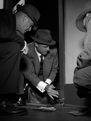 In Stan Douglas’ world, it’s all 1940s again, and we feel part of a gangster movie or a crime scene photograph by Weegee. In a play on reality(/ies) and images, those men kneeling on the floor and playing dice from the Midcentury Studio series could well be Humphrey Bogart or a henchman of Bugsy Siegel’s. In truth, the whole scene has been staged by Stan Douglas in 2010. Up to the least detail nothing is “real”, the “authentic” dollar notes have been reprinted and even the traces supposedly left on the wall by previous games have been scratched in by the artist (~’s assistants). But what does it mean to declare an image “false”, in how far can depiction ever be deception?