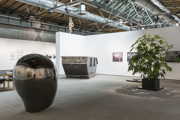 König Gallery’s booth could hold its own even where the big boys play: Alicja Kwade, Camille Henrot, Katharina Grosse, ... Yep, pretty impressive. Eigen&Art Gallery impresses most with small formats of Nicola Samorì, classically styled paintings burned into a copper canvas with sulphuric acid, and served with thickened layers of colour on top. Ikeda Gallery vis-à-vis has interesting granite(?) torpedoes/cigars/zeppelins. You don’t need to assemble their art yourself, despite the name. They’re not even Swedish. Forsblom Gallery is. At least they own a salesroom in Stockholm, besides their Finland headquarters. In Berlin, Forsblom presents a solo position, argh no: solo show, by Reima Nevalainen. Paintings/collages, and a polished-to-mirror sculpture, head-shaped.