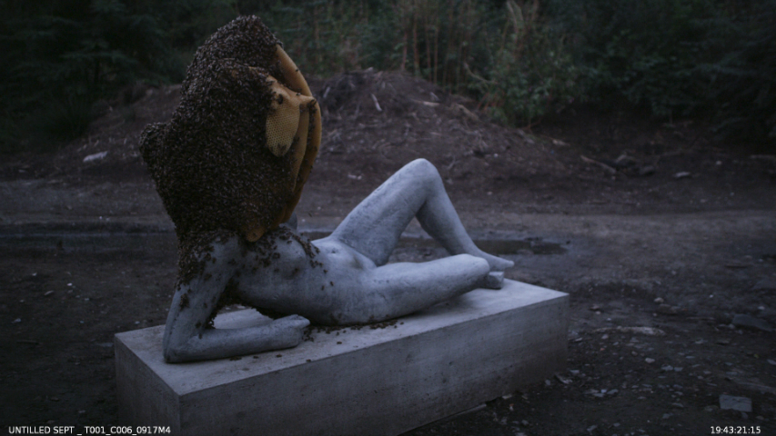 A video continues with animal life. Dog and bee-woman find themselves in the wild, where flies impregnate a decomposing rat. This documents Pierre Huyghe's 2012 dOCUMENTA project, where he placed objects and beings on a recycling ground. It also reminds of that National Geographic documentary about the world after humanity.