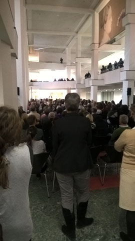 More people arrive from downstairs. And more. A tall blonde gentleman in a plaid tweed suit, red vest, yellow scarp, successfully leads an attack on the lines, he breaks through and won’t come to a stop until he has reached a vantage point immediately in front of the door. He and his companion will enter long before me, with the first wave. You need to be ruthless to make it big. He looks vaguely familiar with his Mozart hair; a curator maybe, or a museum director. The glass doors shut in my face.