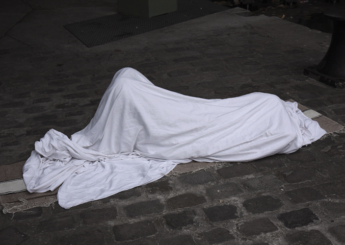 For Implosions, he documented collapsing buildings, for Windows it's views from the inside of ruins, and The Migrants show homeless people sleeping in “body bags”. They appear as dehumanised, sculptural, abstract forms, which is quite like how they are treated everyday; only in death they become living beings again.
