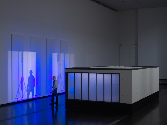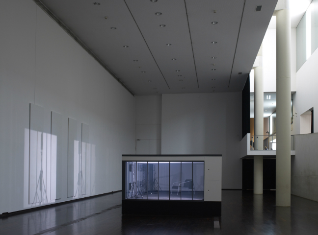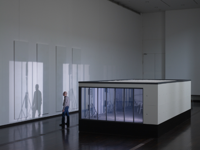 Finally the second temporary installation: Les Grandes Verres by Dominique Blais. A Duchampian title (Le grand verre, 1923) that suits the work more or less. The installation "happens" in several steps: First there is darkness, with a closed greenhouse next to a row of empty chairs. Blue light falls out, to throw the shadows of robotic floodlights against a wall. The cabin gets fully illuminated, and we distinguish another chair inside. As you have undoubtedly realised yourself, this is questioning the relations and contradictions of architecture, light and time. Sometimes the writing of a press release seems to involve more creativity than the artwork itself.