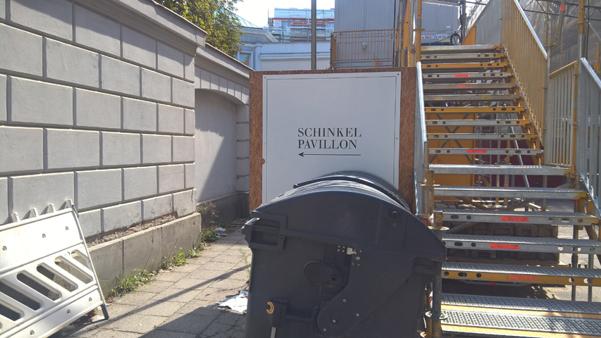 When you venture on an expedition to Schinkel’s, we strongly advice you not to go alone. Definitely, you should equip more than one GPS, and better take an old fashioned map too just to be sure. Wearing a helmet is one more good idea. We will not bore you with details of our straying through the scaffoldings, passing ruins and bottomless abysses, virtually abandoning all hope of ever seeing civilization again; will tell nothing of the anguish and despair when the water bottle’s last and long spared drop oozes down a parched gullet under the merciless eyes of sweaty shadows clinging to an edifice's steely straitjacket. You too will have too much time to ponder life’s last questions until in a moment of epiphany you'll espy the words Schinkel Pavillon (not in burning letters) inscribed on cardboard with an arrow pointing to a wall. Upon closer inspection – fruitlessly searching for a secret door -, you discover a narrow passage through garbage cans and heaps of debris. Feeling all the excitement of a reborn Howard Carter you fall upon a sudden opening. There are no mummies waiting, yet something not entirely unrelated as you’re soon to understand.