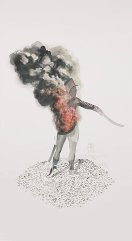 Fireli Baéz, Those Who Would Douse it (It Does Not Disturb Me To Accept That There Are Places Where My Identity Is Obscure To Me, And The Fact That It Amazes You Does Not Mean I Relinquish It, 2018, and not for the title (alone) that will prevent its being mentioned in almost every other media, but because the ideology is dressed in such an artful way. Coloured drawings on colonial documents and maps, you immediately understand why Baéz chose to become an artist, not a teacher, and this counts for a lot already. It looks spectacular, and she has a message that you can agree with, or not. Baéz also shows larger formats, e.g. an African (assumption...) officer (assumption) signalling his (assumption - could self-identify as a neuter) army from a hilltop, ignorant of the flames devouring his backpack (potentially filled with loot and bribes), as history will reduce him to ashes soon. Not less outstanding: Sarah Haq’s live reed growing from the floor, sown into the parquet, a work invading almost every room.