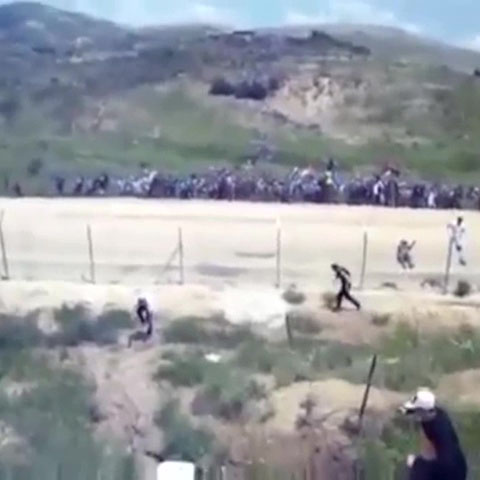 Die Ausstellung setzt sich in einem schmalen Korridor fort mit vielen flackernden Bildschirmen. Wir sehen Szenen aus einer Wüste, hören arabische Sprachfetzen, hektisch, aufgeregt, und der Wandtext belehrt uns, dies seien die Golanhöhen, die syrische Grenze, es ist 2011 und Familien (potentiell auch Kombattanten), die sich seit Jahrzehnten über das Niemandsland hinweg zuschrien, durchbrechen die Barrieren, in mehreren Todesopfern unter israelischem Gewehrfeuer resultierend. Die Stimmen sind uneindeutig, drücken gleichenteils Panik und Wiedersehensfreude aus. Nur die Angst vor Landminen war unbegründet, welcher Fakt der Installation zu ihrem Namen verhilft: Die ganze Zeit waren da keine Landminen.