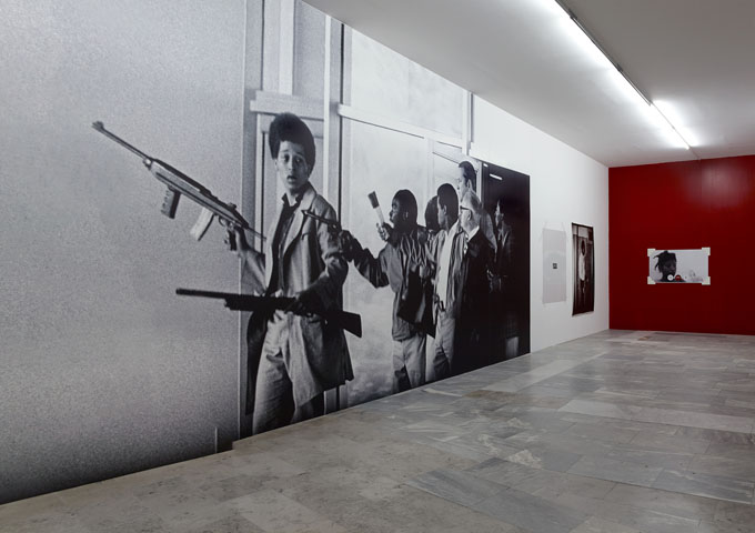 The official starting point is on ground floor, but you may also go upstairs first. You’ll find ring binders on a table there, lots of them, a collection of newspaper articles, book catalogues, and photos of art and cultural artefacts - An artwork very much executed in an Abby Warburg state of mind. Documents in no apparent order, some of African, some of American, some even of Berlin(?) origin; left without any comment they invite to study and (over-)interpretation. A monochrome wallpaper in the same room features an enlarged press photo with the headline: “3 Negroes lynched at Duluth, Minnesota, for rape, October 1919”. It’s graphic. (Tell me, would it really be any better if that read: “3 African-Americans...”? Too many people tend to say “yes” nowadays.) 1919, that’s not so long ago you’d think, and yet: almost a century. It won’t interest you at all, but I own a Packers shirt with the same year printed big on the chest, the team’s founding date. History come alive, dark history, and how much has changed? The (readymade) artwork is not intended for a salute to early #metoo campaigns, but seeking to highlight the wilful murder of (presumably) innocents, their true crime being black. A historic #BlackLivesMatter, never confuse your hashtags. Jaffa opposes it with a photo of heavily armed black men throwing gang signs.